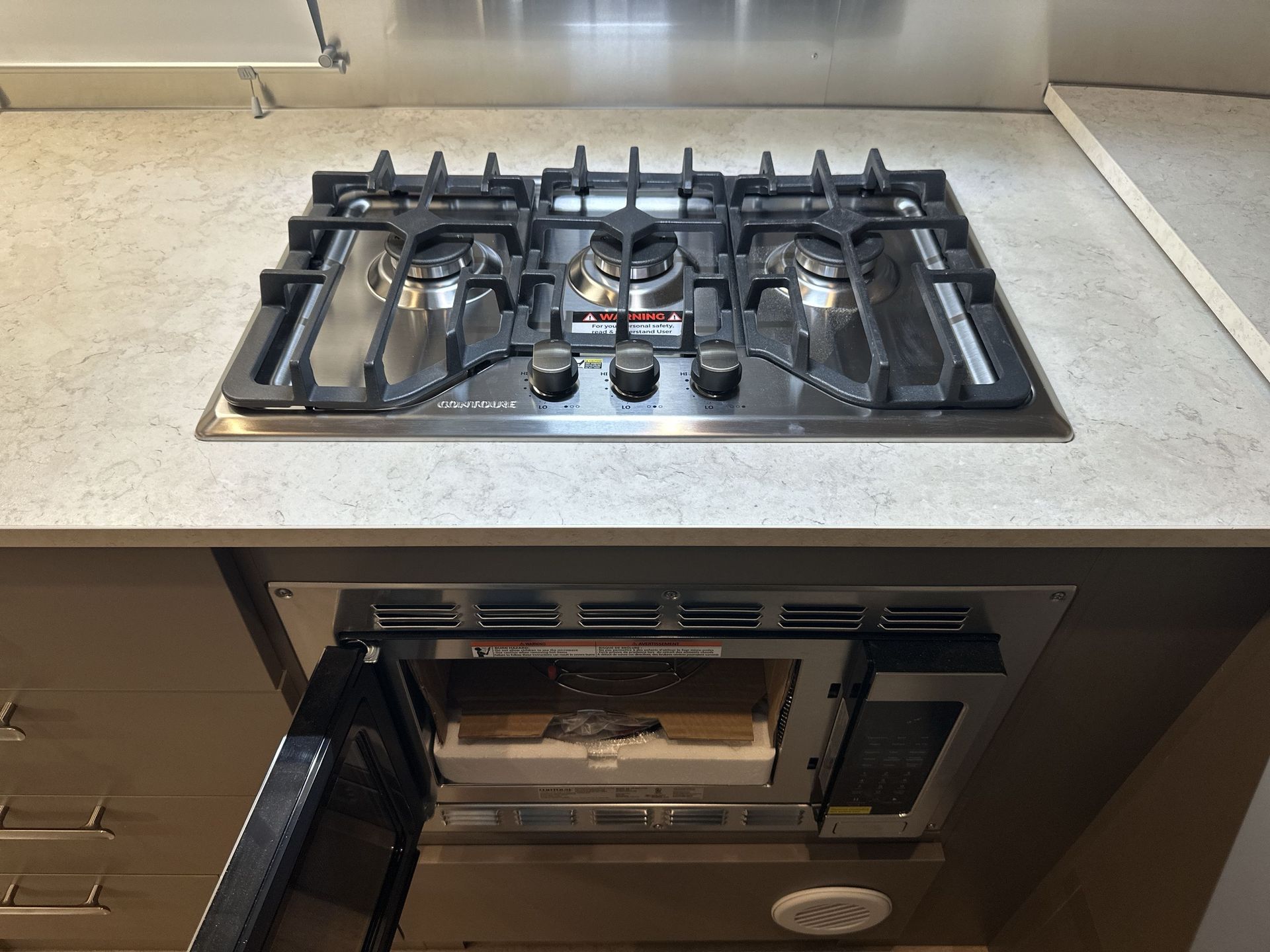 Inside, the 20FB features a thoughtfully designed floor plan that maximizes every inch of space. The front bedroom includes a cozy double bed with ample under-bed storage, providing a restful retreat after a day of exploration. The rear kitchen is equipped with a three-burner stove, convection microwave, and a compact refrigerator, making meal preparation convenient and enjoyable. The central dinette offers a comfortable area for dining or relaxation and can convert into additional sleeping space for guests.