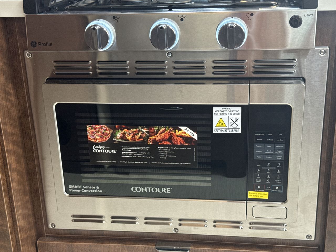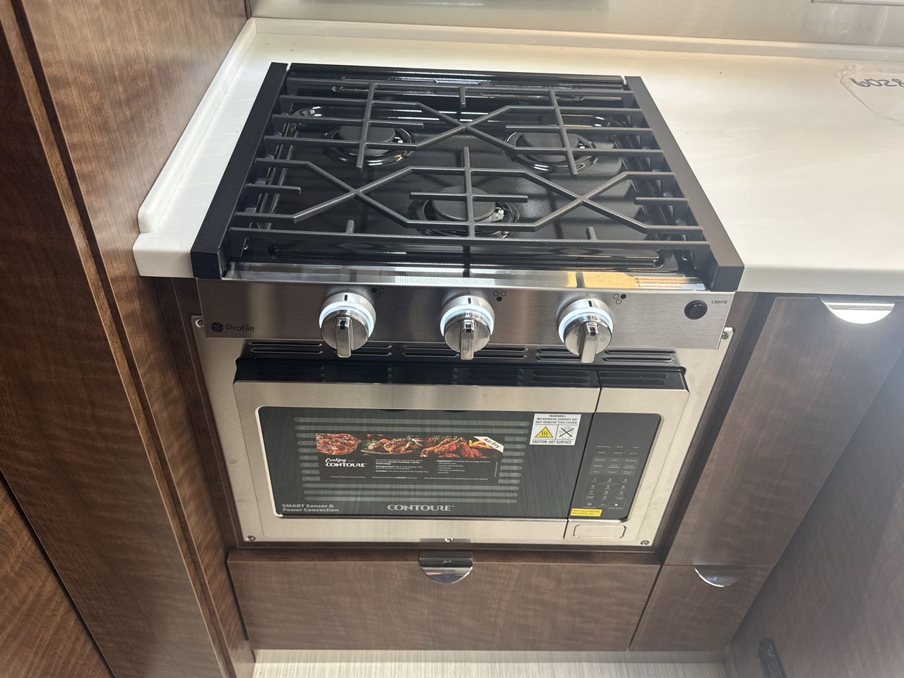 The living area includes a lounge space with a modern sofa and a dinette that converts into additional sleeping quarters. High-quality cabinetry and soft-close drawers offer ample storage. The fully equipped kitchen boasts a stainless-steel gas stove, microwave, and a sizeable refrigerator. Solid-surface countertops provide ample space for meal preparation.