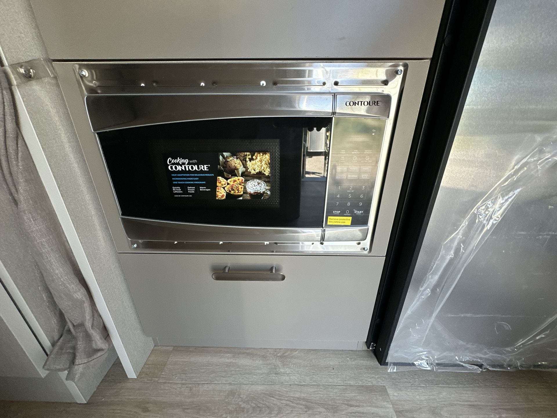 Inside, the Caravel 16RB is thoughtfully designed to maximize space and comfort. The rear bedroom features a 48" x 78" double bed with ample storage underneath, providing a cozy retreat after a day of exploration. The dinette area comfortably seats four and can be converted into an additional sleeping space measuring 40" x 91", accommodating up to four people in total. The kitchen is equipped with a two-burner stove, microwave, and a 3.1 cu. ft. 12V electric refrigerator, along with elegant cabinetry that offers plenty of storage for food and utensils. The bathroom includes a European-style wet bath with a shower, toilet, and sink, designed for efficient use of space.