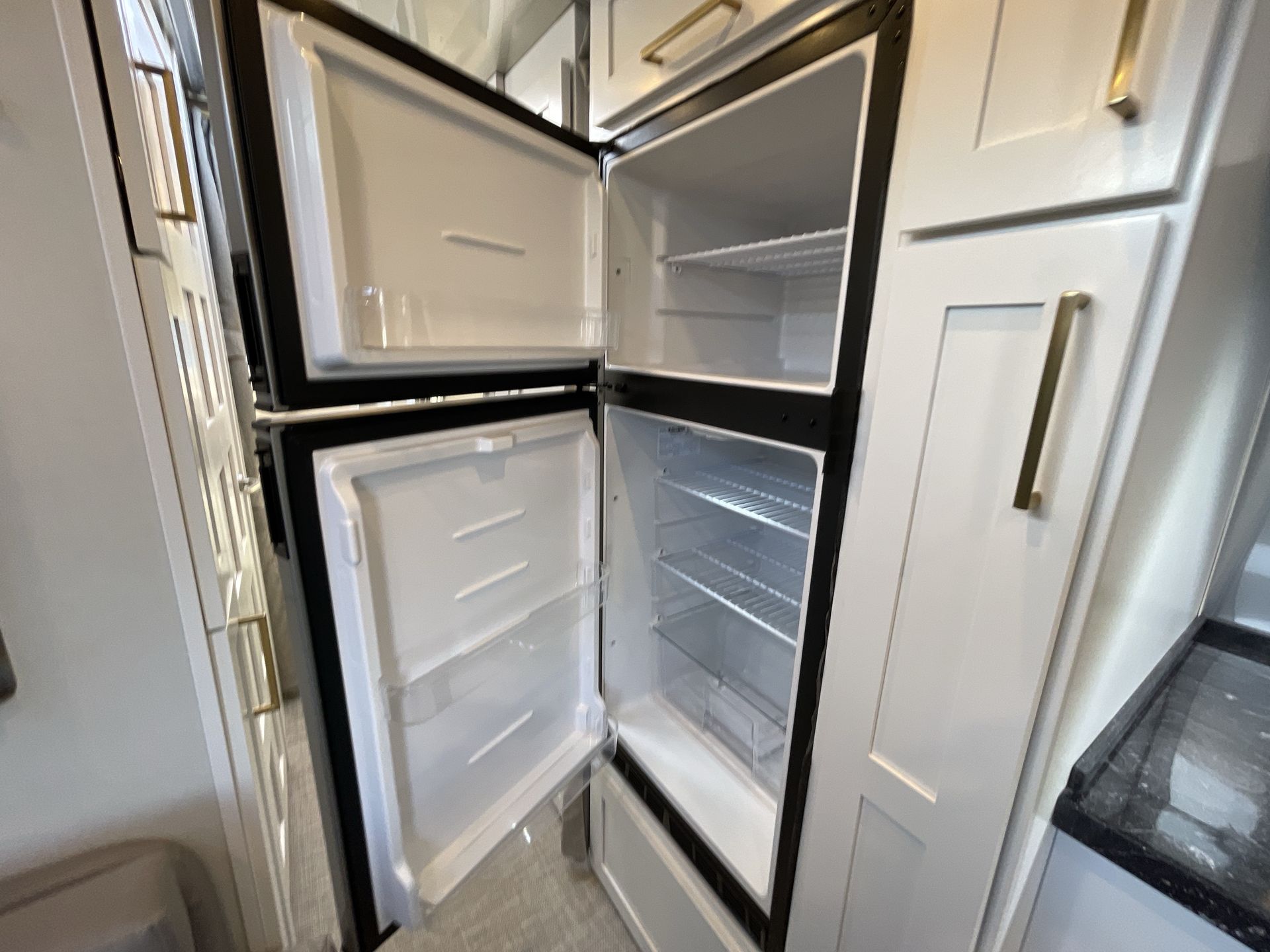 The well-appointed kitchen includes high-end appliances such as a three-burner gas stove, oven, convection microwave, and an 8.2 cubic foot refrigerator. Solid surface countertops and a large stainless steel sink make meal preparation convenient and enjoyable. Ample cabinet space ensures you have room for all your cooking essentials.