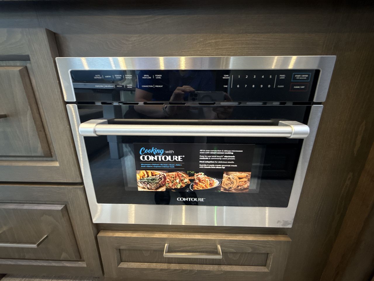 The kitchen is equipped with high-end appliances, including a three-burner gas stove, oven, convection microwave, and a mid-size refrigerator, facilitating easy meal preparation. The large stainless steel sink and generous counter space enhance the cooking experience. A powered dinette comfortably seats four and can convert into an extra sleeping area with the touch of a button.