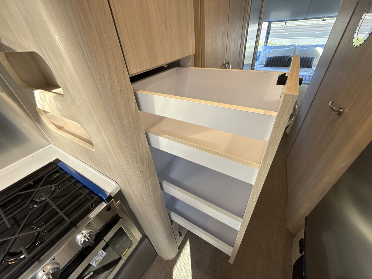 At the rear, the bedroom features a comfortable queen-size bed with plush bedding. Surrounding storage options, such as overhead compartments and spacious wardrobes, provide ample space for your belongings. Large windows allow natural light to fill the room, creating a peaceful setting for rest after a day of adventure.