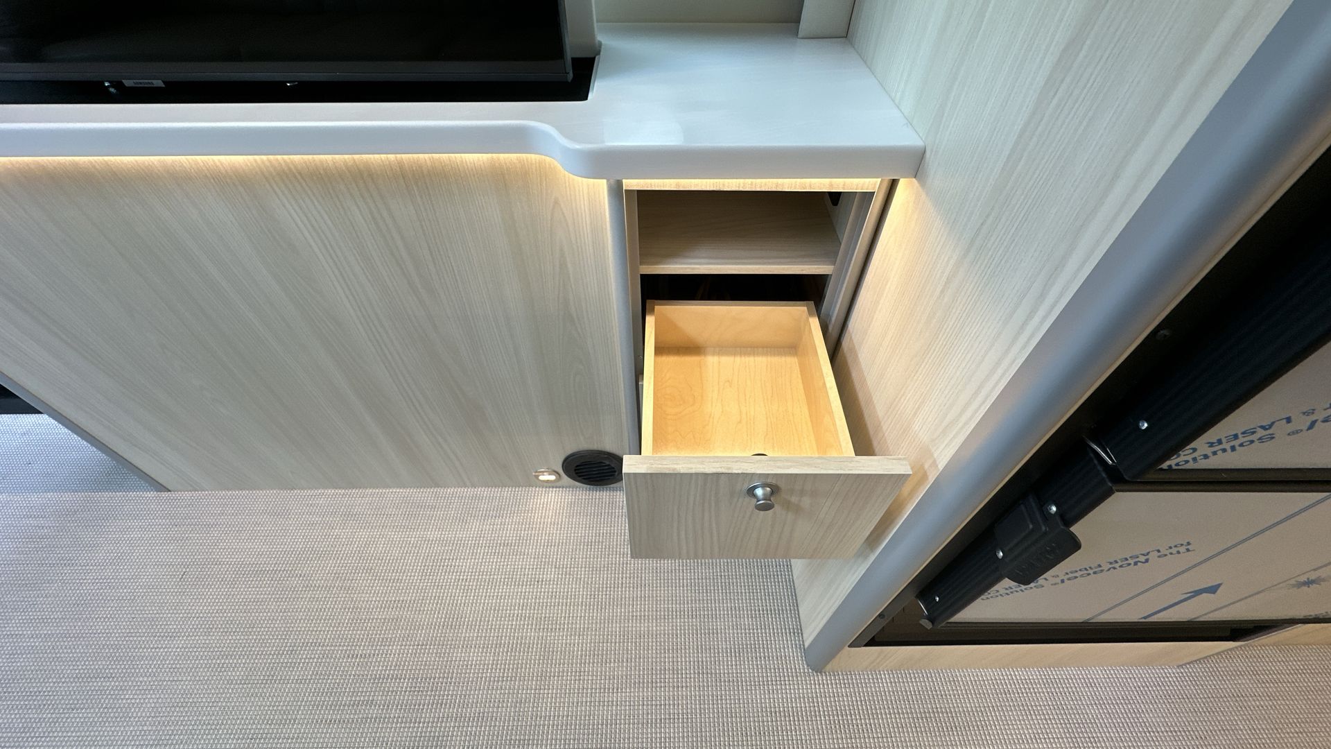 Tech-savvy travelers will appreciate the Atlas's advanced features. The onboard entertainment system includes a 40™ Samsung® LED Smart TV that rises out of the media cabinet via remote control, and a high-quality sound system. For connectivity, the Atlas offers built-in Wi-Fi capability, allowing you to stay connected wherever your travels take you.