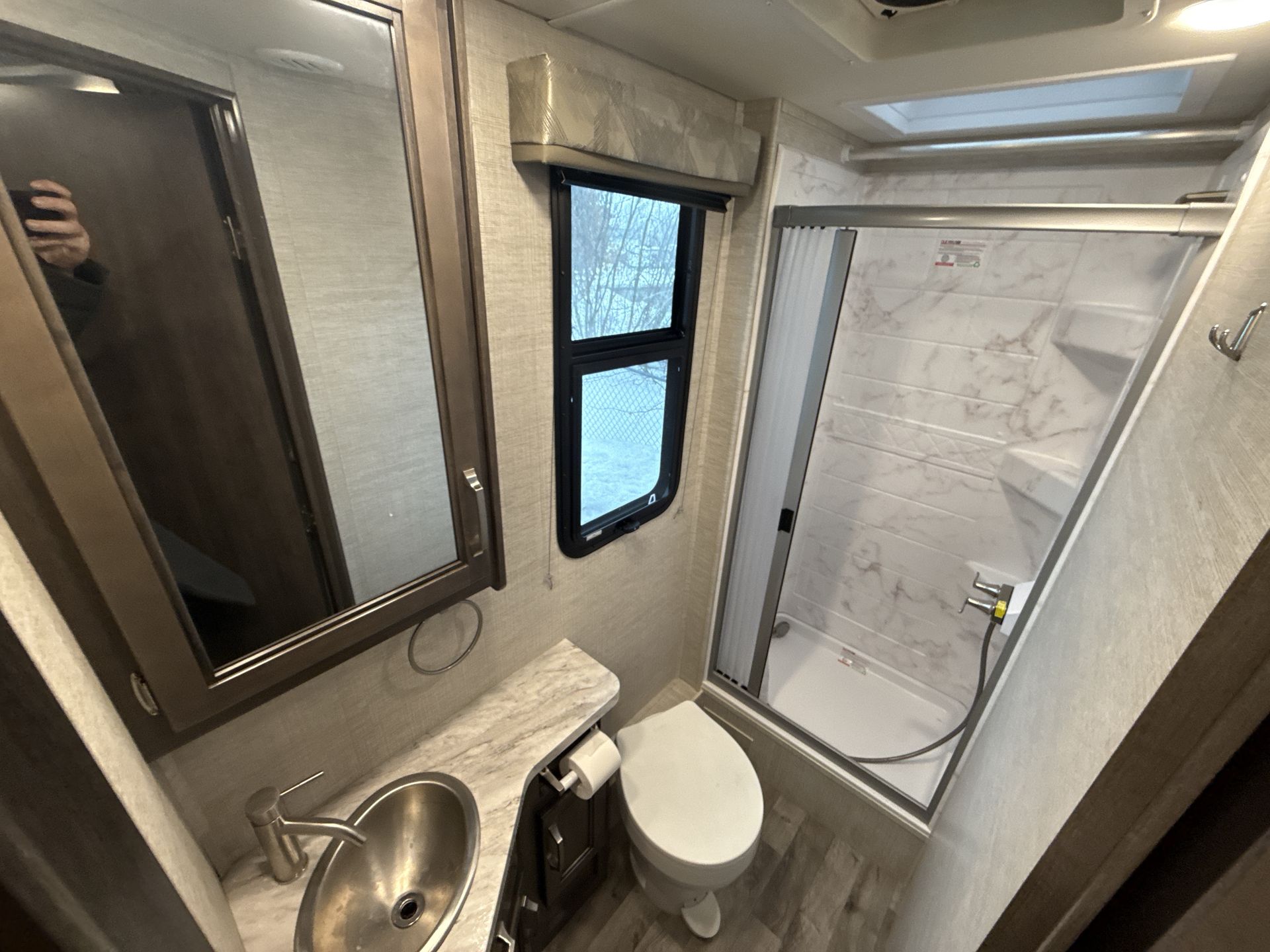 The well-appointed bathroom includes a shower, toilet, and sink, with thoughtful storage solutions to keep your essentials organized.